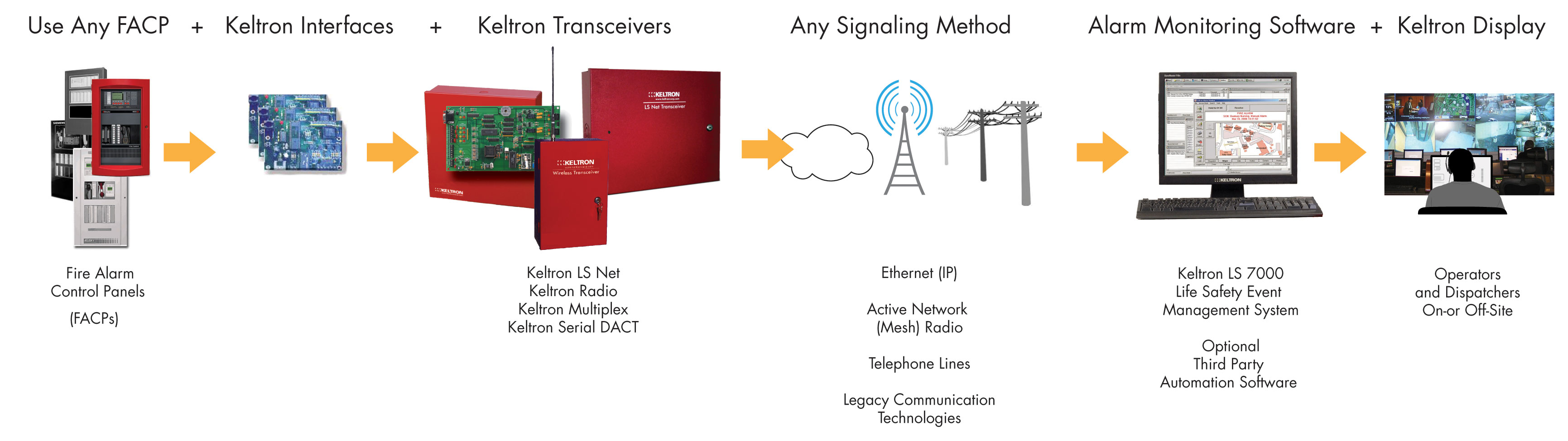 This UL 864 listed system provides efficient and reliable incident monitoring for multi-building facilities and municipal environments. Keltron LS Net transceivers receive addressable signals from more than 65 different models and brands of alarm panels and transmit the information via a standard, secure, supervised Ethernet network to the Keltron LS 7000 on-site dispatch station. The easy-to-operate, flexible, and scalable Keltron LS 7000 provides comprehensive dispatch information and essential history records.